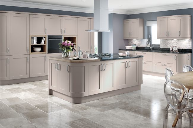 Shaker style solid wood door on the base units & a cream coloured door on the wall units with colour coordinated cabinets, shaker doors are timeless & work well in modern & traditional homes, quartz work surfaces to finish it off. New Bold, Chesterfield