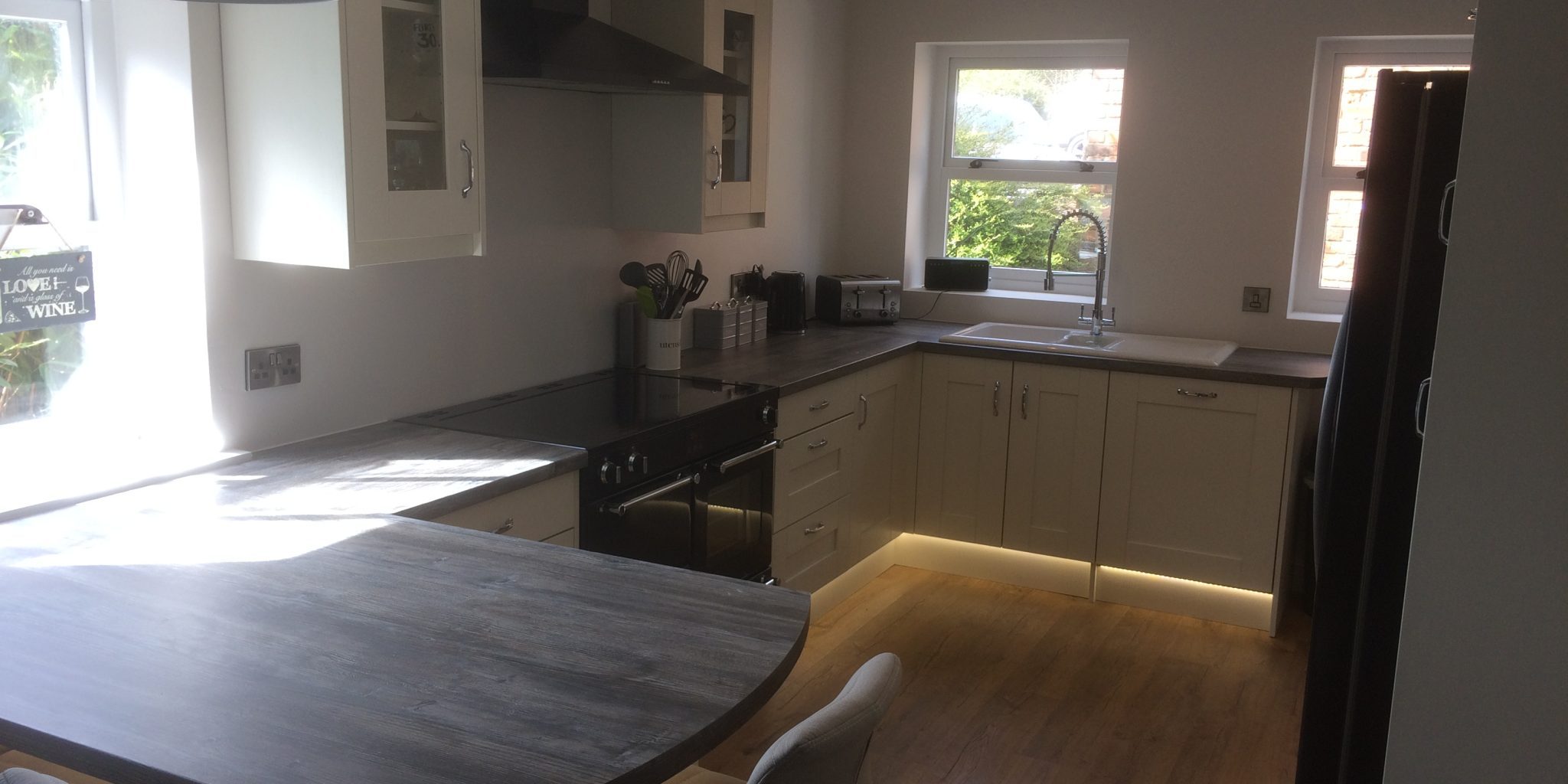 Shaker style in solid wood painted cream finish with laminate worktops. CNC machined18mm carcases with soft closing doors & drawers.